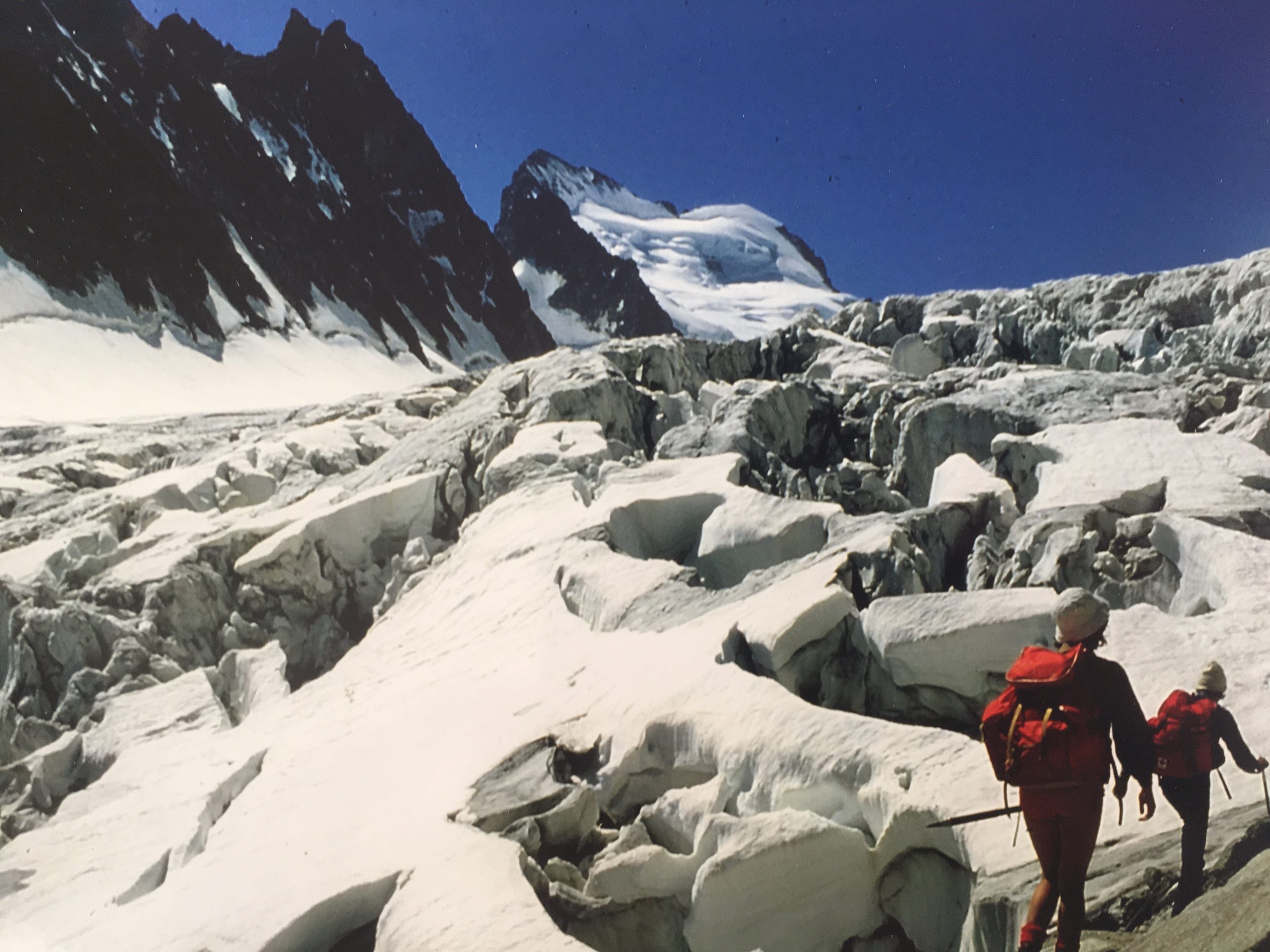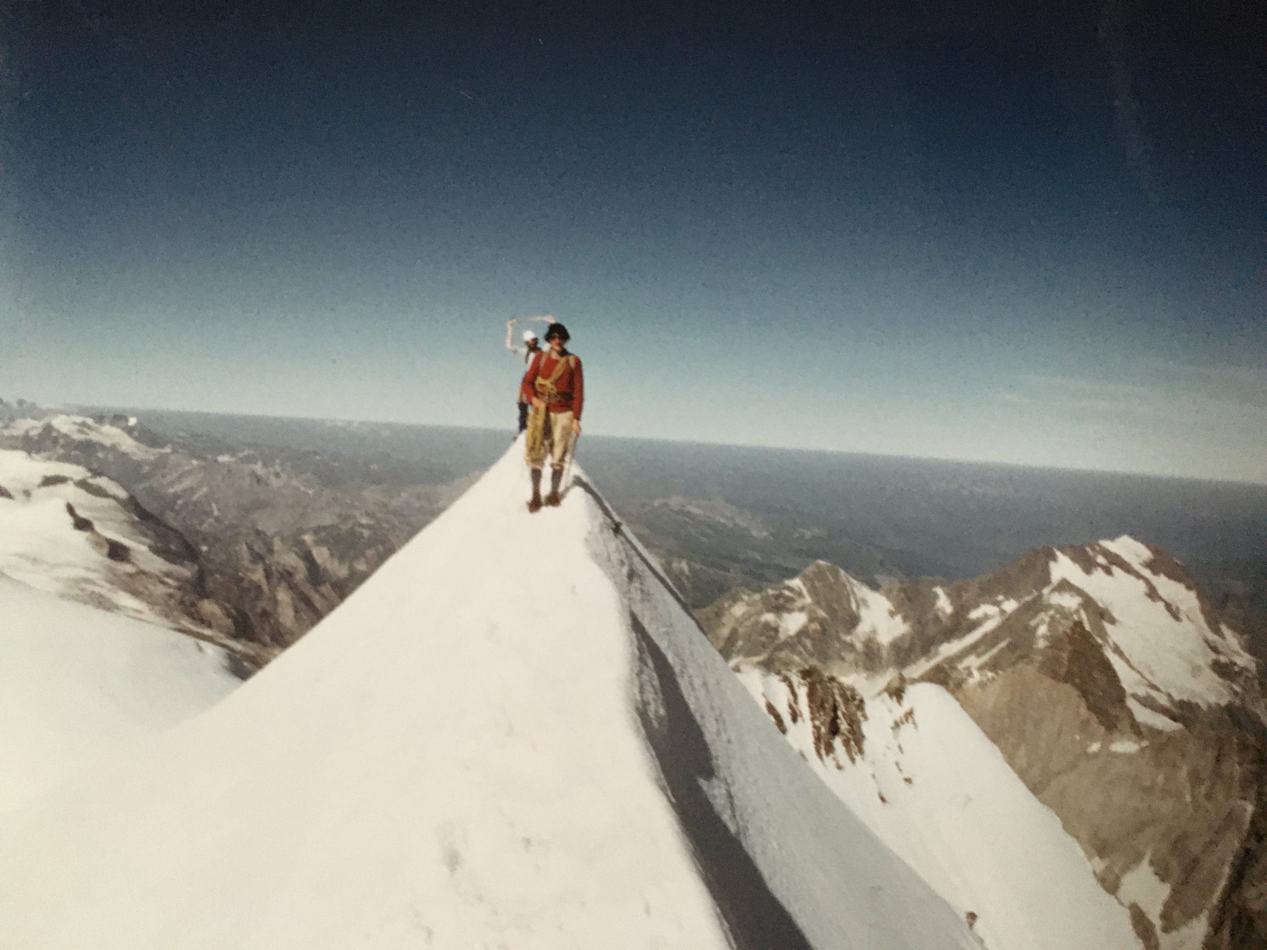 Des escalades réalisées, je garde en mémoire l’ascension de la Grande Casse en Vanoise qui culmine à 3855 mètres d’altitude. Pourquoi ce nom curieux de « la grande casse » ? Le 14 juillet 1892, un Capitaine chargé de former des militaires à l’alpinisme, encadrait un escadron sans aucune expérience pour réaliser cette ascension. Perdus dans le brouillard, ils ont dévissé et y ont laissé la vie. Quand on connait cette histoire, on se dit que le choix du nom est assez lugubre. A partir de cet évènement quelque peu inquiétant et sur l’insistance de nos épouses, nous engageons un guide pour assurer notre sécurité. L’ascension est assez longue et raide, mais sans difficulté particulière. Notre guide, chargé de rédiger un article avec clichés sur la Grande Casse, se désencorde pour nous prendre en photo sous les meilleurs angles ! Ce contexte un peu particulier nous convient car nous pouvons progresser à notre propre rythme compte tenu de l’importance de la pente et de sa longueur. Un magnifique souvenir de montagne.