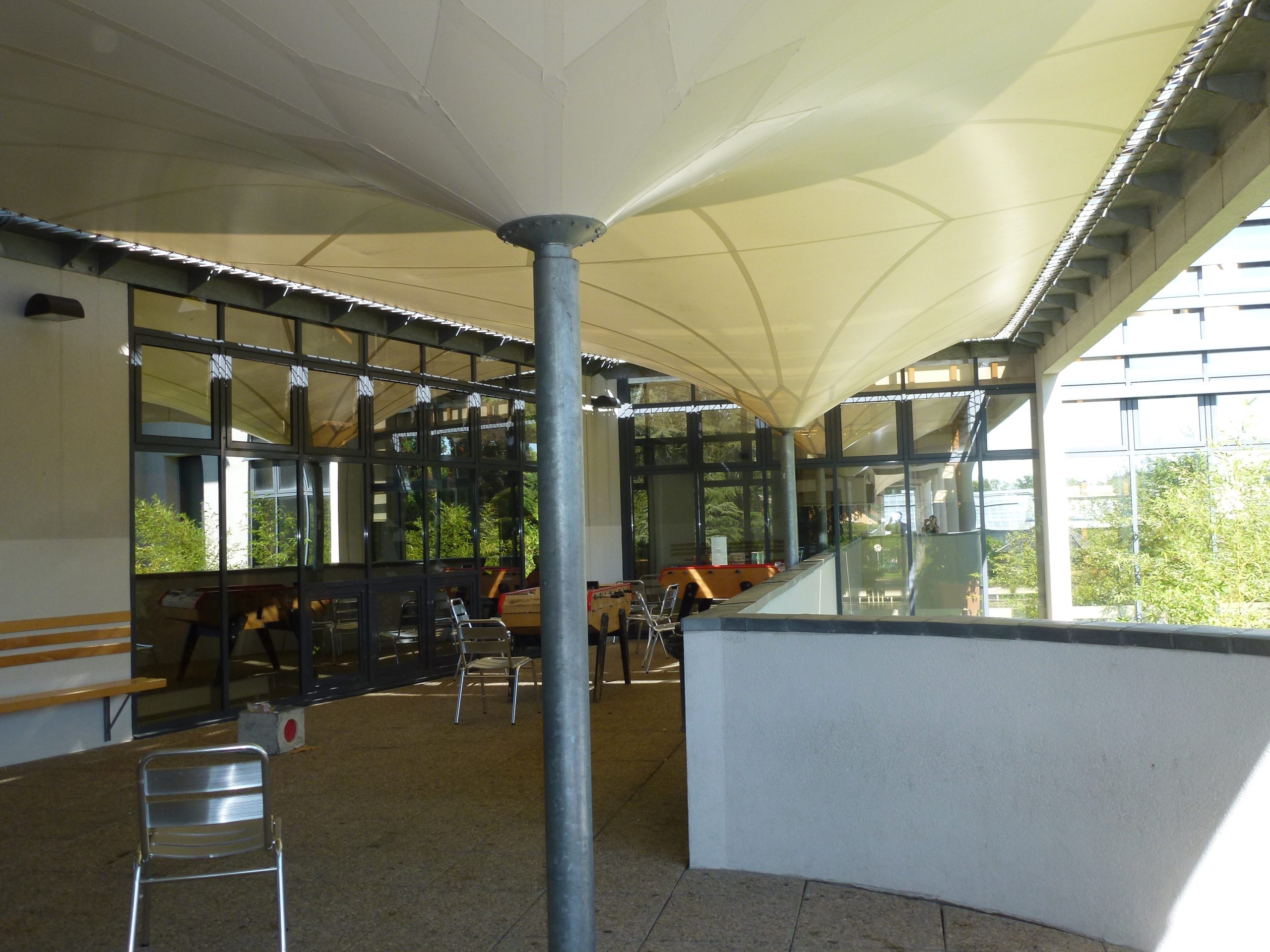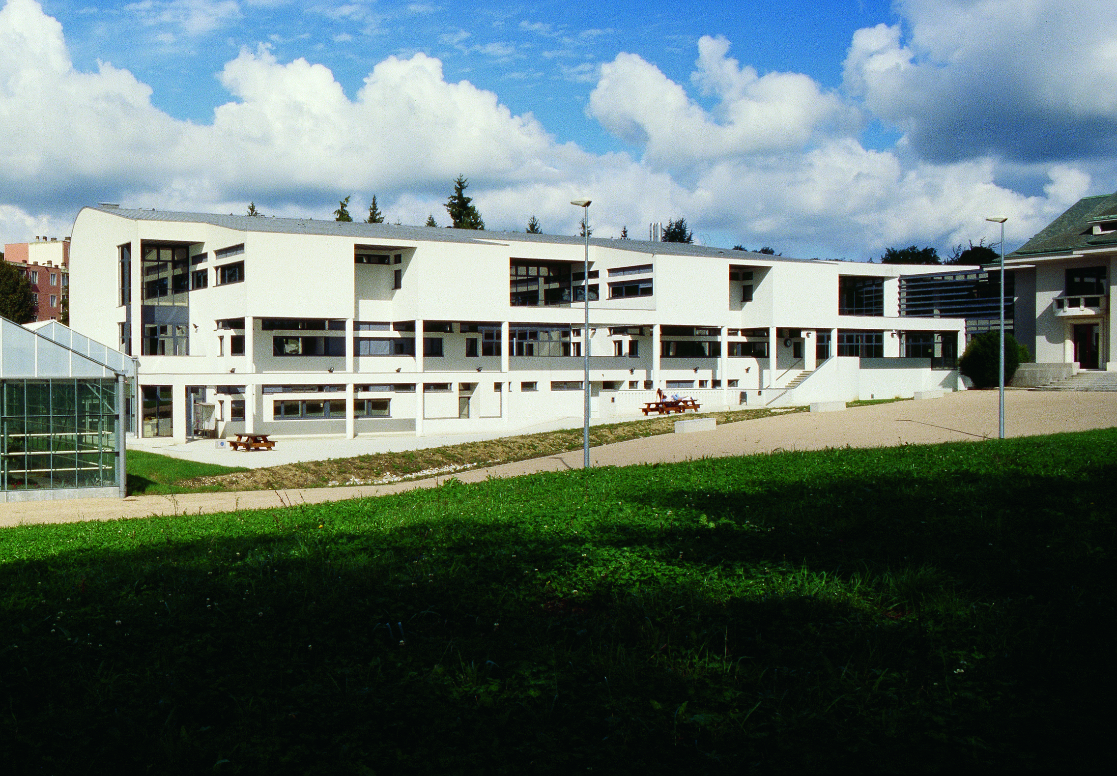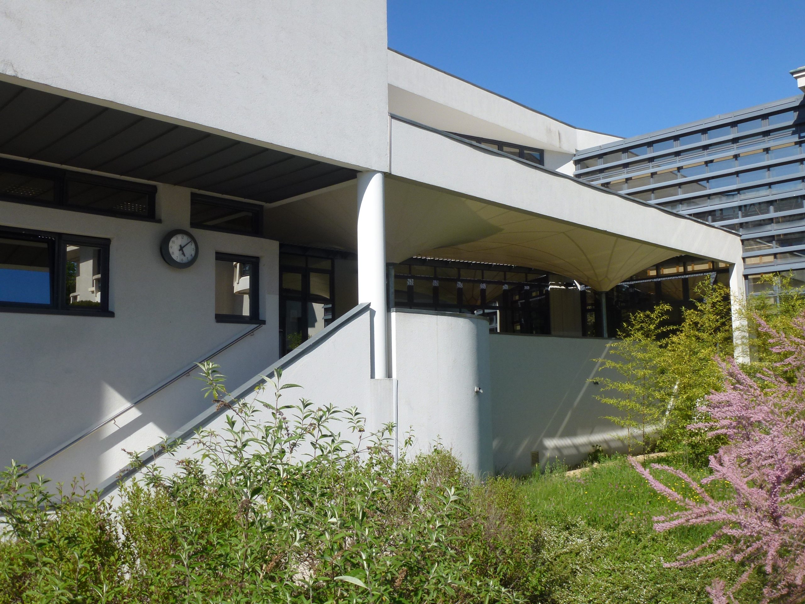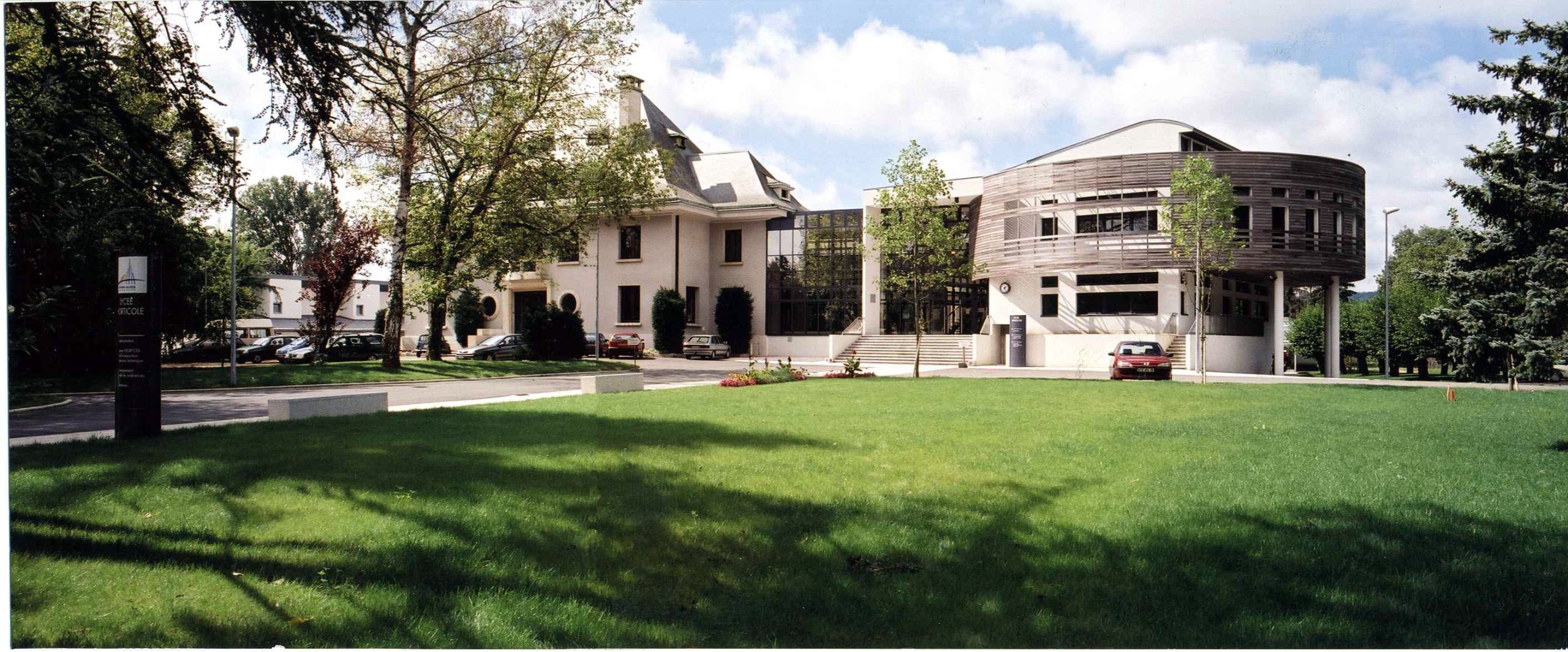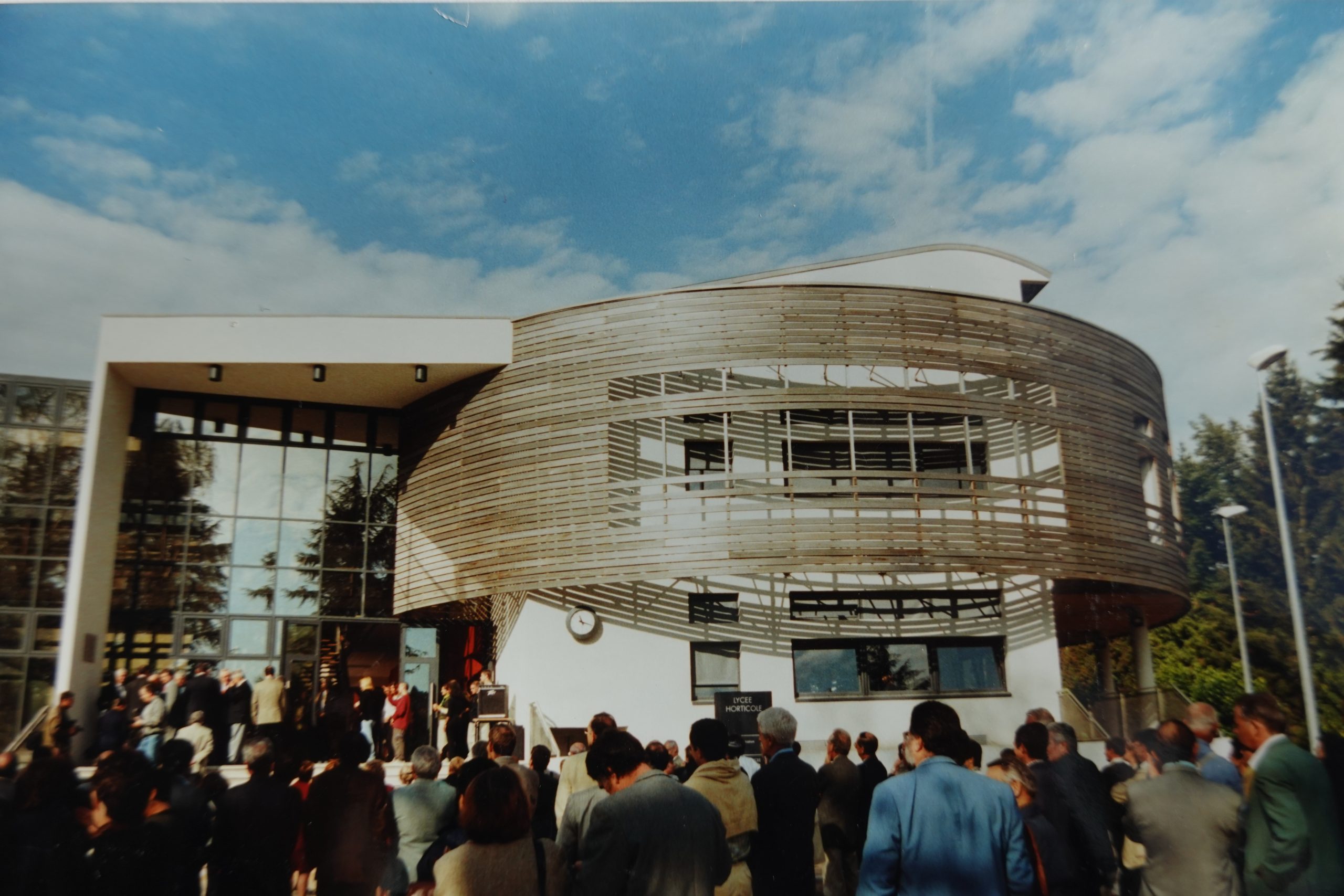 Ainsi fut fait. Nous rendons le concours avec une très belle image d’entrée composée de trois éléments. A gauche, la maison de maître restaurée et dans laquelle nous installons très confortablement toute l’administration et des locaux dévolus aux étudiants, au centre une grande entrée vitrée s’ouvrant en transparent sur les serres florales et les terres pédagogiques, à droite le CDI 1 suspendu à l’étage, image contemporaine entourée en cercle de planches de Red Cedar pré-vieillies.